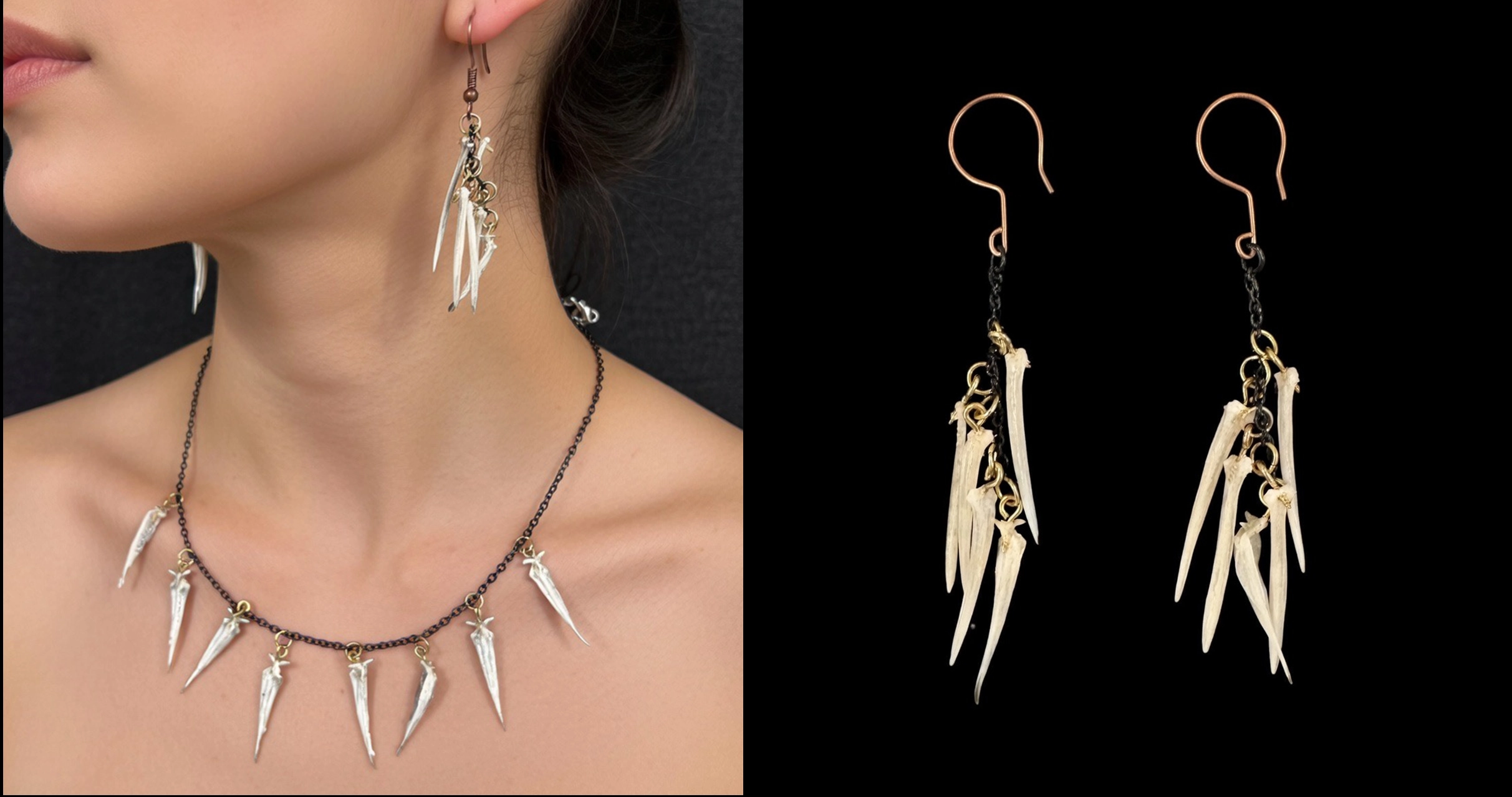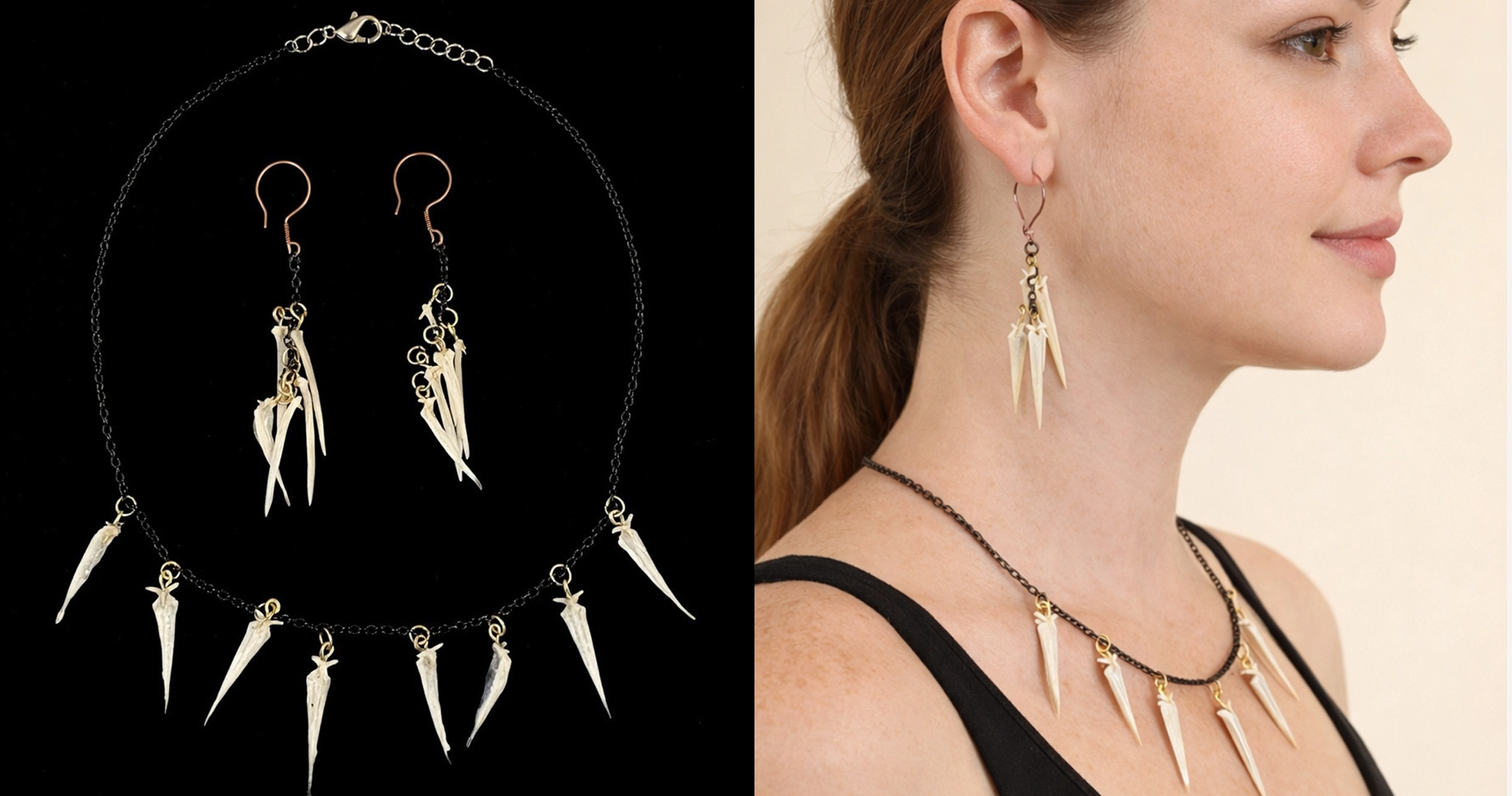 Earrings & Necklace created from Tilapia Bones, black chain and gold colored rings.
