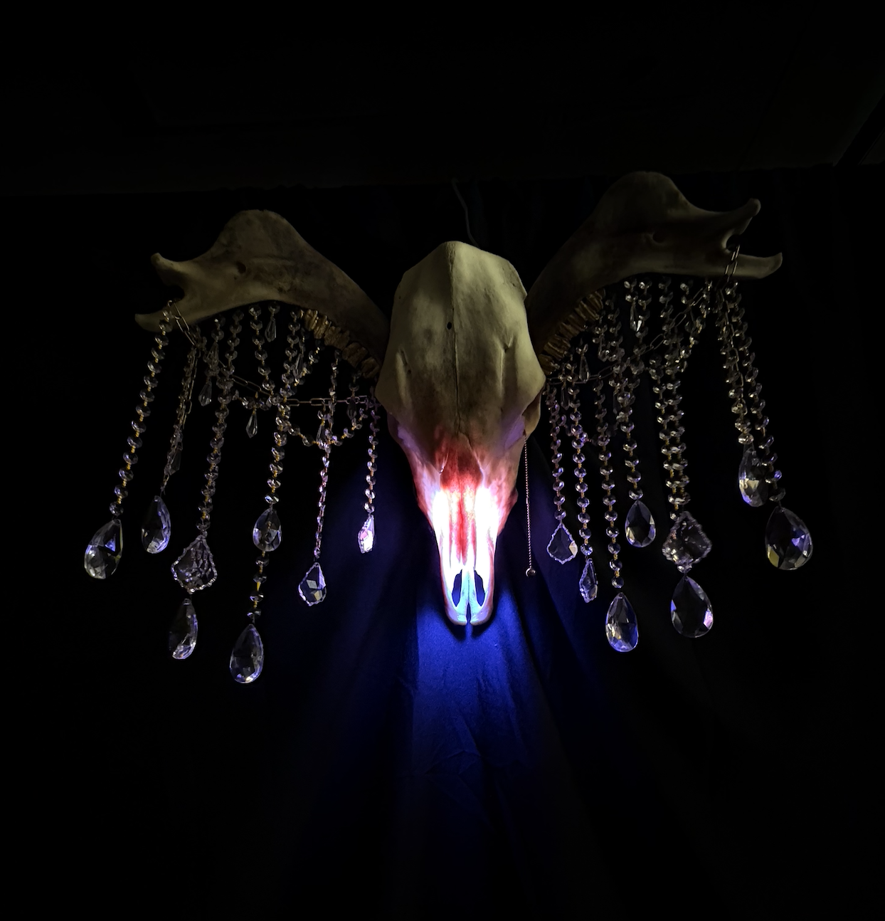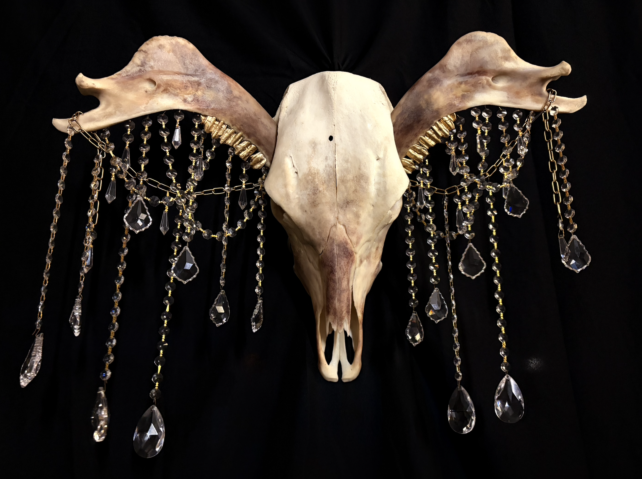 * Vintage Crystal Accents: Hand-strung chandelier crystals suspended from the jaw, adding a touch of ‘Macabre Elegance’ and light-refraction to the piece.