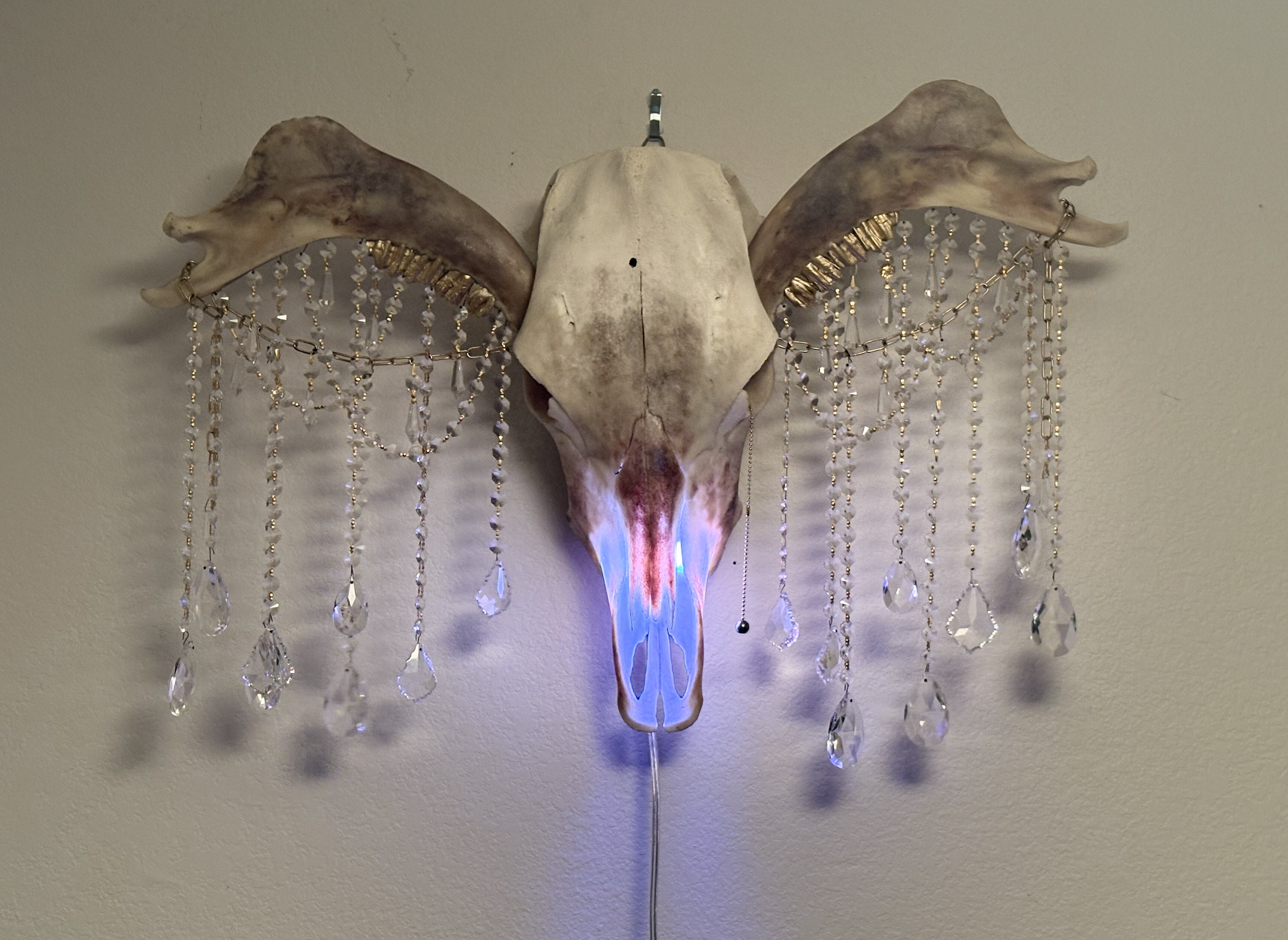 Our skeletal fine art honors this titan of Irish folklore. We’ve re-imagined the Donn Cuailnge as a lighted reliquary, utilizing a real bovine skull with jawbones articulated as towering horns. Hand-strung with vintage chandelier crystals and illuminated from within, this piece transforms rawanatomy into shimmering legend.