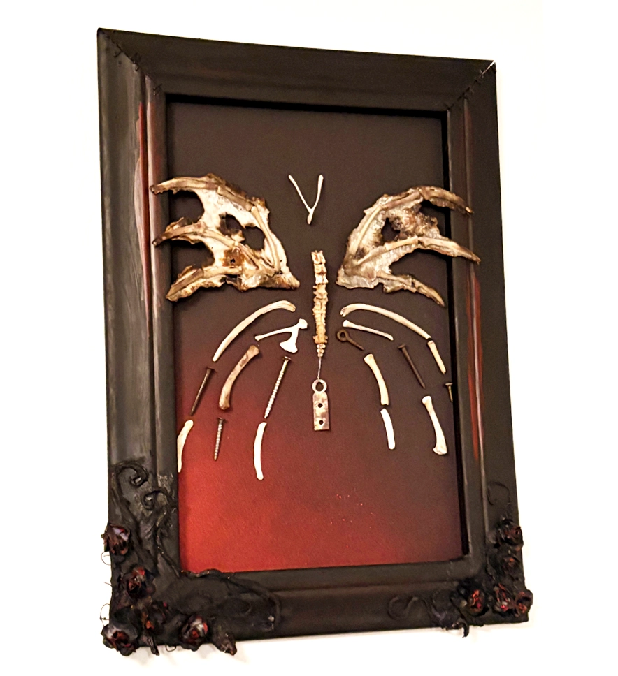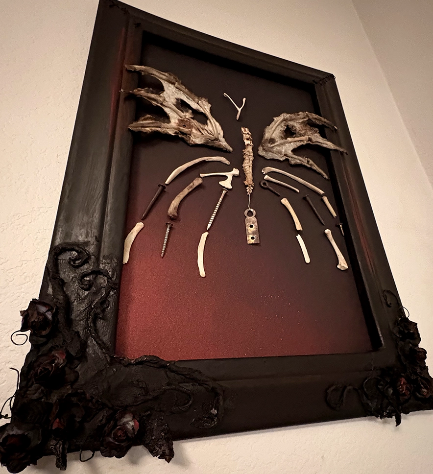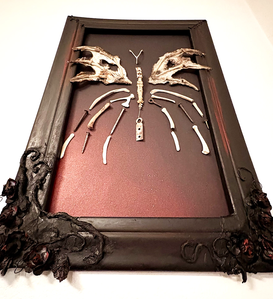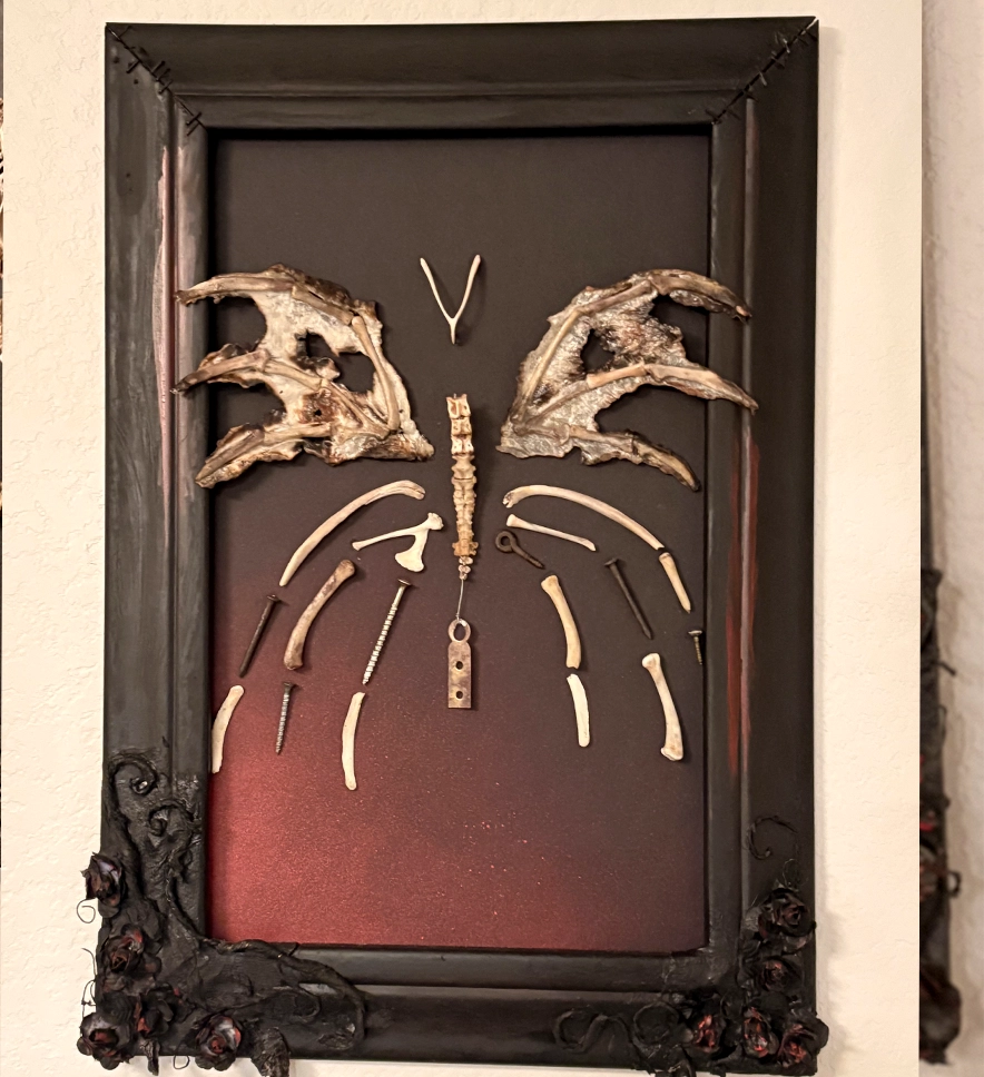 contrast between the fragile beauty of iridescent wings and the stark, enduring reality of the skeletal form. It is a physical meditation on